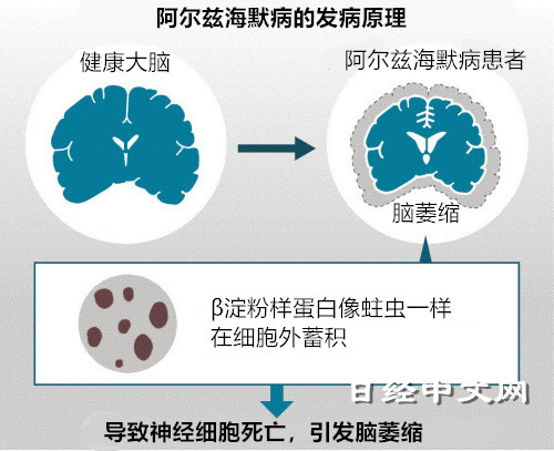 虽然阿尔茨海默病的发病原因尚不清楚,但已经查明的是,患者脑部蓄积了一种叫做“β淀粉样蛋白(amyloid-β)”的蛋白质,逐渐导致神经细胞受损,并最终造成脑萎缩。很多科学家和制药企业认为,只要清除淀粉样蛋白,就可以阻止病情的发展,因此一直在挑战可阻碍淀粉样蛋白的药物研发。