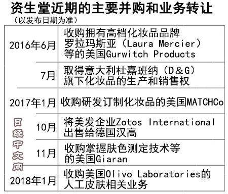 资生堂正在加速投资化妆品相关初创企业。近期从美国企业手中收购了人工皮肤相关业务,将研发涂在皮肤上后能迅速祛皱的化妆品。资生堂社长鱼谷雅彦在接受日本经济新闻(中文版:日经中文网)采访时强调,“将创造新类别的化妆品”。此外,资生堂2017年还收购了人工智能(AI)相关企业等,通过并购获取有助于研发新一代化妆品的关键技术。
