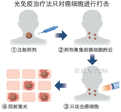 光免疫疗法首先给患者注射癌细胞的附着药剂。等药剂聚集到癌细胞附近后,照射近红外激光,通过精确定位破坏这些癌细胞。