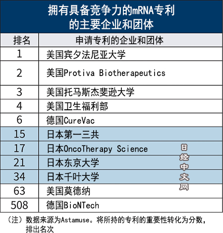 从日本企业来看,第一三共拥有的专利排在第15位。这是用于治疗体力逐渐下降的“肌肉萎缩症”的mRNA技术,于2005年申请专利。东京大学和千叶大学等拥有的专利也获得高度评价,在排名前50的专利中,4项来自日本企业。可以说在每项专利的价值方面,日本企业也具备一定竞争力。