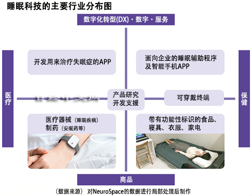 睡眠科技市场以“数字与商品”、“医疗与保健”为两大轴心,大致分为4个市场。比如,安眠药等药品属于“医疗领域”,标有“改善睡眠质量”的饮料和保健品属于“保健领域”。