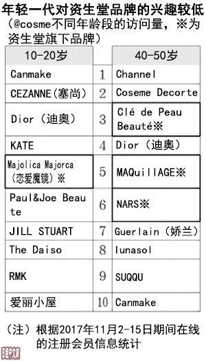 实际上,通过美容信息网站“@cosme”的访问量可以看出,在十几岁女生中,进入前10的资生堂品牌只有恋爱魔镜,排在第五位。从中很难体会到资生堂身为与日本国内销售额第二名有两倍之差的顶尖企业的强大。排在前面的都是中老年女性不熟悉的主力企业和海外品牌。