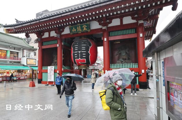 在东京的浅草寺,每年在春节期间都会有很多中国游客。浅草寺雷门附近的商业街上27日虽然也很热闹,但戴口罩的人明显增多。
