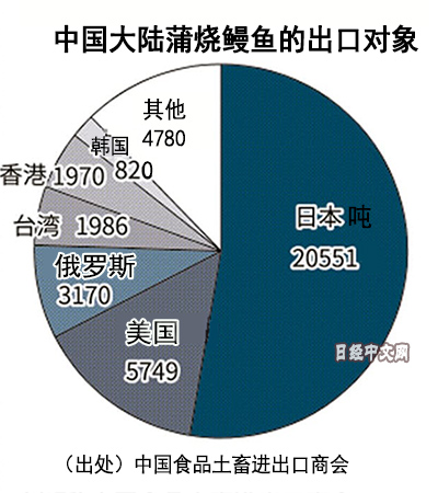 中国大陆2018年的鳗鱼出口量中,仅蒲烧鳗鱼就达4万吨左右。其中,对日本的出口量为2万吨,与上年持平。一方面,对美国的出口量增加2成,对泰国和新加坡的出口量增加2~3成,对越南的出口量增加8成。在台湾和东南亚的回转寿司店,鳗鱼是仅次于三文鱼的热门食材。