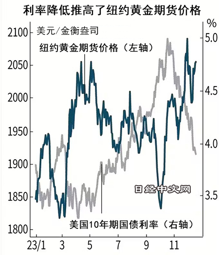 金价上涨的背景是,因对美联储(FRB)转换货币政策充满期待,美国长期利率下降。12月13日,美联储主席鲍威尔在美国联邦公开市场委员会(FOMC)会议结束后举行的记者会上明确表示,讨论了降息而不是新一轮加息的时间。目前美国长期利率徘徊在4%以下。