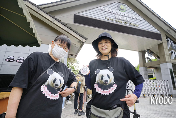| 身穿印有“香香”头像的统一款式T恤的日本游客沼田千鹤(右)等人(6月12日、中国四川省雅安市、KYODO) |