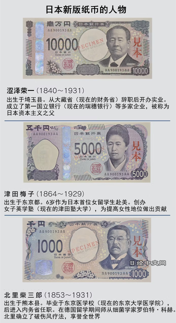 日本7月3日发行新纸币。这是20年来首次更新设计,被称为日本资本主义之父的涩泽荣一是1万日元纸币的新人物。新版纸币采用全球首创的防伪技术。本文就新版纸币汇总了3个要点: