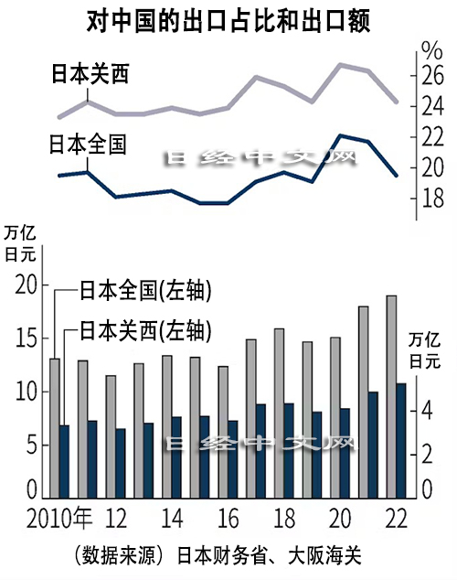 据大阪海关统计,关西2022年的出口额同比增长16%,达到21万6265亿日元,其中,对中国的出口额同比增长8%,达到5万2477亿日元。对中国出口在关西出口额中所占的比例为24%,高于日本全国平均(19%),可见对中国的依赖度较高。