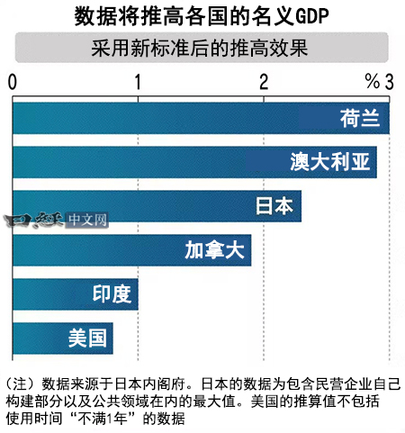 如果各国开始采用新标准,名义GDP将会增加。日本内阁府经济社会综合研究所的估算数据显示,预计10至20年内日本名义GDP的年均水平将被抬高1%至2%多。从其他国家来看,预计荷兰的名义GDP将被推高3.0%,澳大利亚2.9%,加拿大1.9%,印度1.0%,美国0.8%。