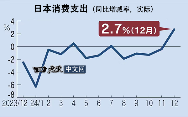 目前出现了改善的迹象。2024年12月的消费支出同比增长了2.7%,实际支出时隔4个月出现增加。汽车购买增加,此外,服装和内衣等购买也有所增加,“服装及鞋类”支出增长了4.1%。