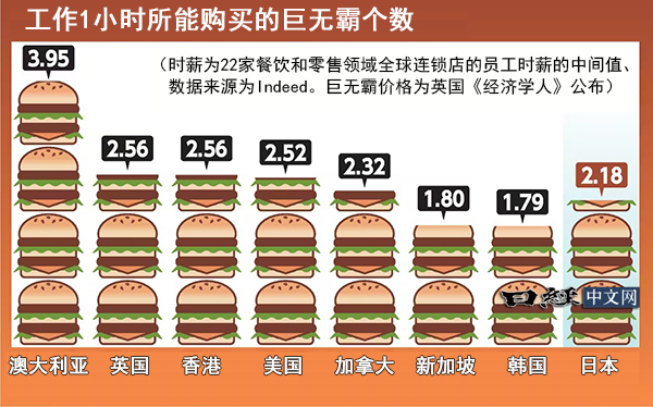 本次利用招聘搜索服务商Indeed的数据。按国家和地区统计了包括麦当劳在内的22家餐饮和零售领域全球连锁店的店铺员工时薪。把这些数据和英国《经济学人》公布的巨无霸汉堡的当地价格结合,计算出每个国家和地区工作1小时可以购买的巨无霸数量。相当于用同样的商品来衡量同样工作的价值。