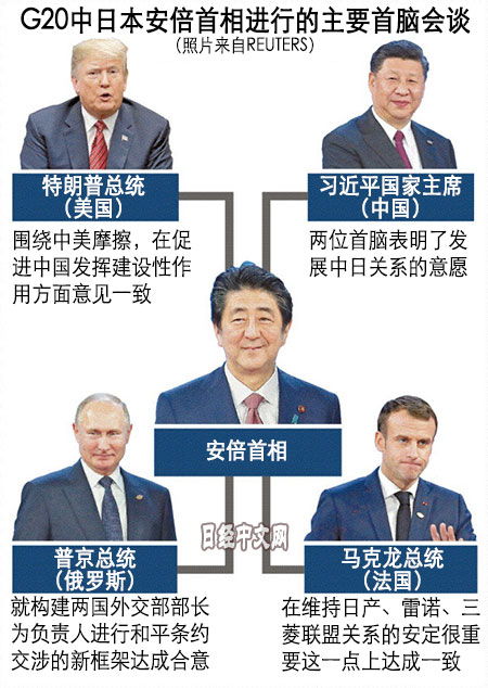 日本首相安倍晋三正在以同美国总统特朗普的良好关系为武器,在俄罗斯、中国、欧洲之间展开平衡外交。2019年6月底在大阪召开的二十国集团(G20)峰会上,安倍还将亲自担任主席。由于长期执政的效果和各国首脑的凝聚力下降等原因,安倍正在成为倡导自由贸易的主导者。
