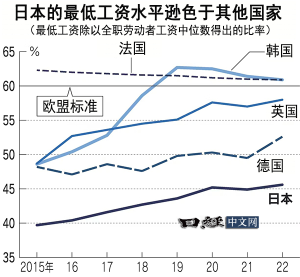 日本内阁府根据经济合作与发展组织(OECD)的数据对比了各国的最低工资,发现日本明显较低。从2022年最低工资除以普通劳动者(正式员工等)的工资中位数得出的比率来看,日本为45.6%,低于主要国家。日本要保持涨薪势头,通过提高最低工资来托底也很重要。