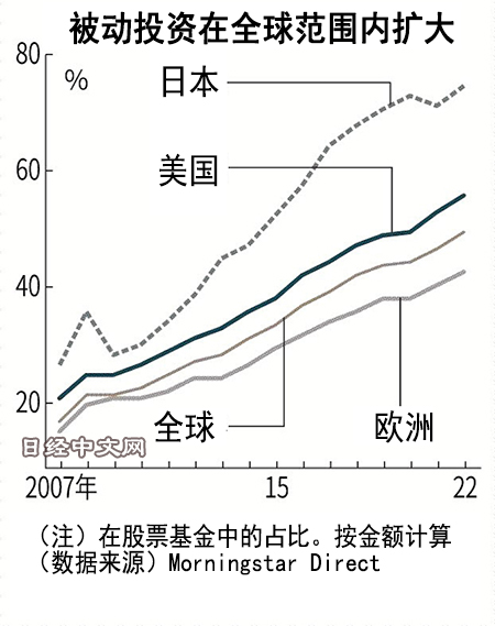 被动投资正在成为全世界的投资主流。从被动投资在各国股票基金中所占的比例来看,日本为7成,美国为5成,欧洲为4成。各个国家的这一比例都在提高。