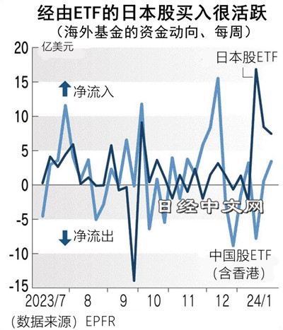 反映海外投资者对日本股票的关注度提高的是以日本股票为对象的ETF的人气。调查公司EPFR的数据显示,海外的日本股票ETF在年初开始的5周内共流入31亿美元。作为5周的流入金额,创出2023年6~7月(33亿美元)以来的新高。