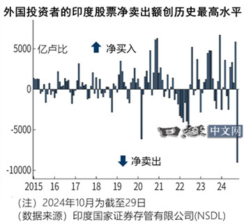 印度国家证券存管有限公司(NSDL)的数据显示,在10月,海外机构投资者截至10月29日净卖出了9093亿卢比(约合人民币771亿元)的印度股票。大幅超过因新冠疫情蔓延导致全球市场混乱、流出超过6000亿卢比的2020年3月,有可能创出NSDL公开的2002年以来的最大月度净卖出额。