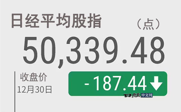 在日本股市2025年最后一个交易日的12月30日,东京股市上日经平均股指连续2天下跌。收于5万339.48点,较前一交易日下跌187.44点,跌幅为0.37%。