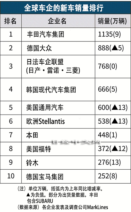 日本经济新闻(中文版:日经中文网)依据丰田1月28日发布的数据等汇总的大型汽车企业2021年全球新车销量显示,丰田连续2年排在首位。丰田相比竞争对手更好地抑制半导体短缺对生产的影响,扩大了与第2位的德国大众(VW)的差距。美国通用汽车(GM)的整体销量跌至第5位,但在中国表现强劲的纯电动汽车(EV)销售猛增至上年的2.3倍。