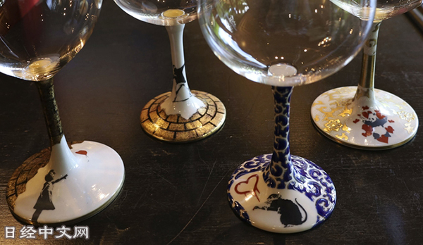 此次开发的葡萄酒杯的杯梗和杯座部分用九谷烧制成。印制了班克西的4幅作品,分别带有老鼠或小女孩等图案,运用传统工艺把图案画在了九谷烧上。