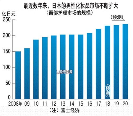 面向男性的化妆品以护肤品为中心,正逐步在市场上浸透。日本富士经济的统计显示,日本男性化妆品(面部护理)的市场规模2018年预计为231亿日元。最近10年逐步增长。如果考虑到购买女性用商品的男性不在少数,潜在市场被认为更加巨大。