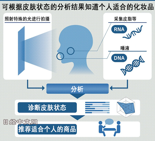 日本的化妆品生产商正在致力于使用最新技术提供从基因和细胞层面进行皮肤分析的服务。花王通过分析皮脂中的RNA(核糖核酸),推荐适合用户本人的化妆品。资生堂则根据唾液中的DNA,利用人工智能(AI)来判断产生皱纹的容易程度等。还有IT企业也涉足这一领域,开发竞争越来越激烈。