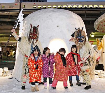 | 日本东北秋田县有名的雪屋和“生剥鬼”临时搬家到东京。图为在东京都JR有乐町站的前面,托儿所的小朋友们和“生剥鬼”们合影纪念。(图/共同) |