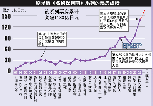 《名侦探柯南》以全球发行量突破2.7亿部的青山刚昌的同名漫画为原作,1996年开始推出动画版。第2年(1997年)开始推出的剧场版系列到今年已是第27部,去年以柯南、灰原哀和“黑衣组织”为主要角色的第26部《黑铁的鱼影》突破100亿日元的票房大关,这是该系列影片首次突破100亿日元。在接连取得佳绩的情况下,此次的新作品也被寄予厚望,期待取得更大突破。