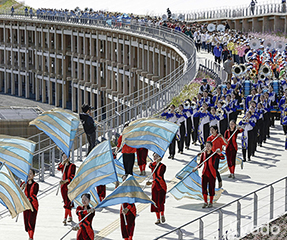日本各地中小学生们参加的行进管乐(Marching Band)活动在大阪关西万博会的标志性会场建筑环状大屋顶“RING”上举行。演奏从世博会开放前的上午8点半开始。共有1万2269人参加……