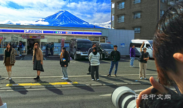 从泰国和朋友一起来旅游的女性(26岁)说:“我在Instagram上看过这样的景色,就很想拍下来”。她说:“便利店和富士山搭在一起,极具‘日本特色’”。