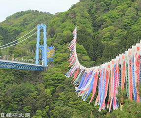 沿着日本茨城县常陆太田市的龙神大吊桥,1000面鲤鱼旗飘荡在遍布新绿的溪谷之上。“龙神峡鲤鱼旗节”于4月29日开幕。2020年和2021年因为新冠疫情没有举办,这次是3年来首次举办。沿着长375米的大桥,架起了2座鲤鱼旗桥……