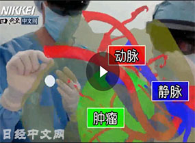 “这是肿瘤,里面有血管”,国际医疗福祉大学三田病院的医生们围着手术台在讨论。医生们带着VR眼镜,手在空中不停地比划。他们眼前浮现的是虚拟3D图像,可以用手指扩大和转动图像……